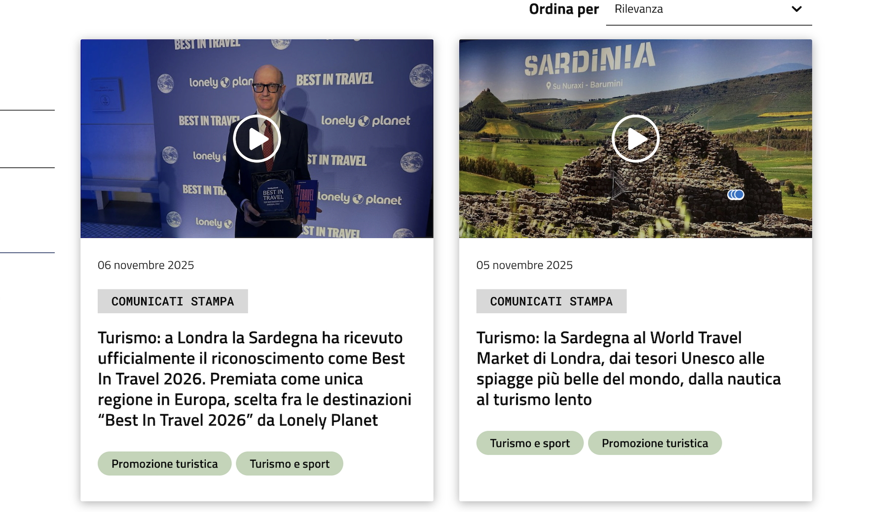 Сардиния официально получила награду «Лучшее направление для путешествий 2026 года» на выставке World Travel Market London 2025. Это был единственный регион в Европе, вошедший в список «Лучших мест для путешествий 2026 года» по версии Lonely Planet. Сокровища ЮНЕСКО, самые красивые пляжи в мире, парусный спорт, медленный туризм и многие другие ценности Сардинии с каждым днём все больше покоряют мир.